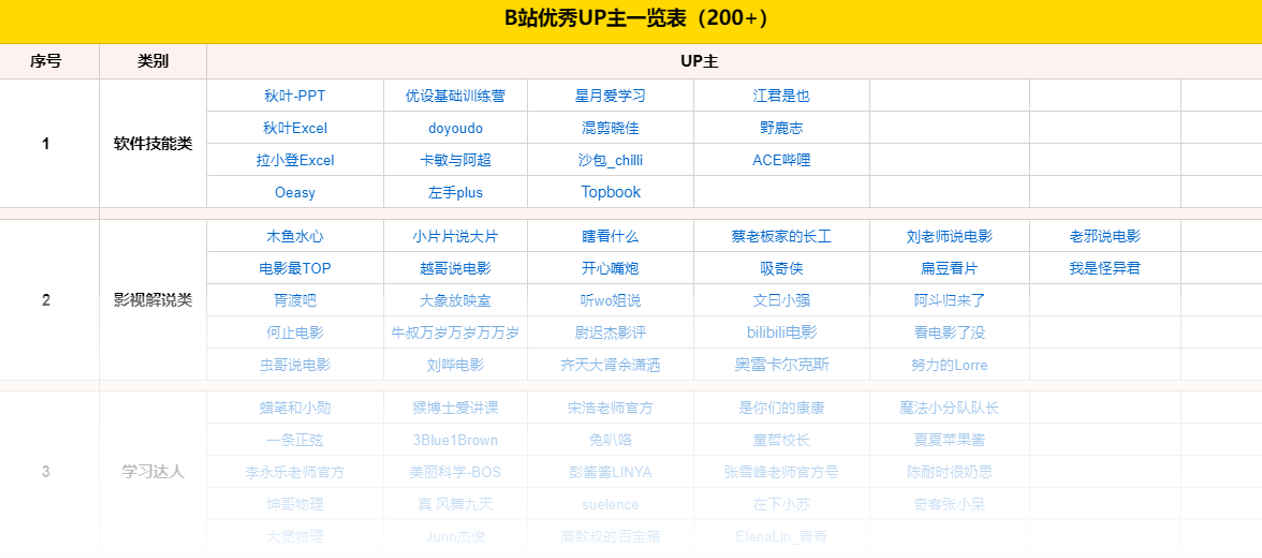 “B站公开数据显示,2019年全年,B站泛常识进修类内容的旁观用户数打破5000万。进修类UP主数量同比增长151%,进修视频播放量同比增长274%。”除了进修区,B站其他范畴也兴起了一多量优良UP主,老秦整理了一下,足足有200多位呢,感兴趣的小伙伴们,快来私信