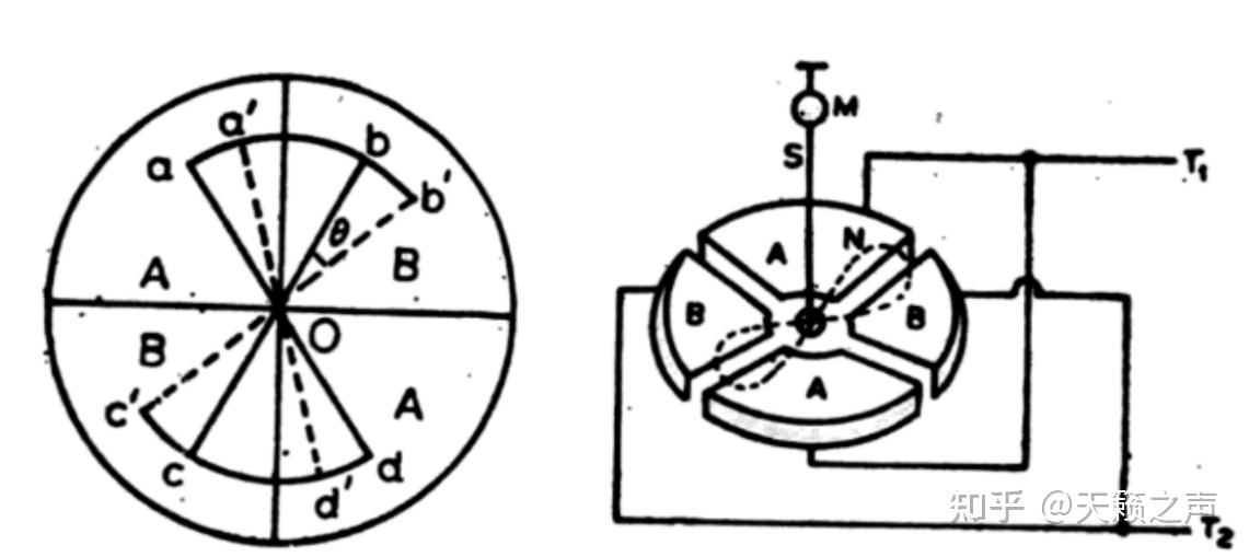 如下图所示,那种静电计的指针是蝴蝶外形的,有一根悬丝S将其垂曲悬挂,下方有四个1/4扇形的电极。若下面左图所示,扇形电极把平面分红4个象限,如右图所示,一三象限电极BB用导线毗连,二四象限电极AA用导线导通,但是AA与BB连结绝缘的形态。从而AA是一个蝴蝶形的等势体,BB也是一个蝴蝶外形的等势体。把待测电势差的导体的正电位与AA相连,负电位与BB相连,同时让指针处于正电位。如许以来因为BB负电荷与指针正电荷吸引,AA的正电荷与B的正电荷排挤,所以会形成领结型指针靠近BB而远离AA,也就是形成指针顺时针改变,我们设改变角为θ。