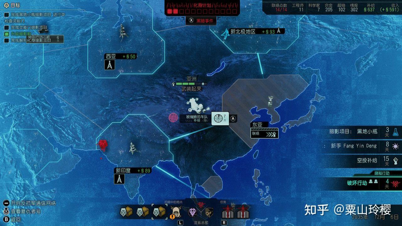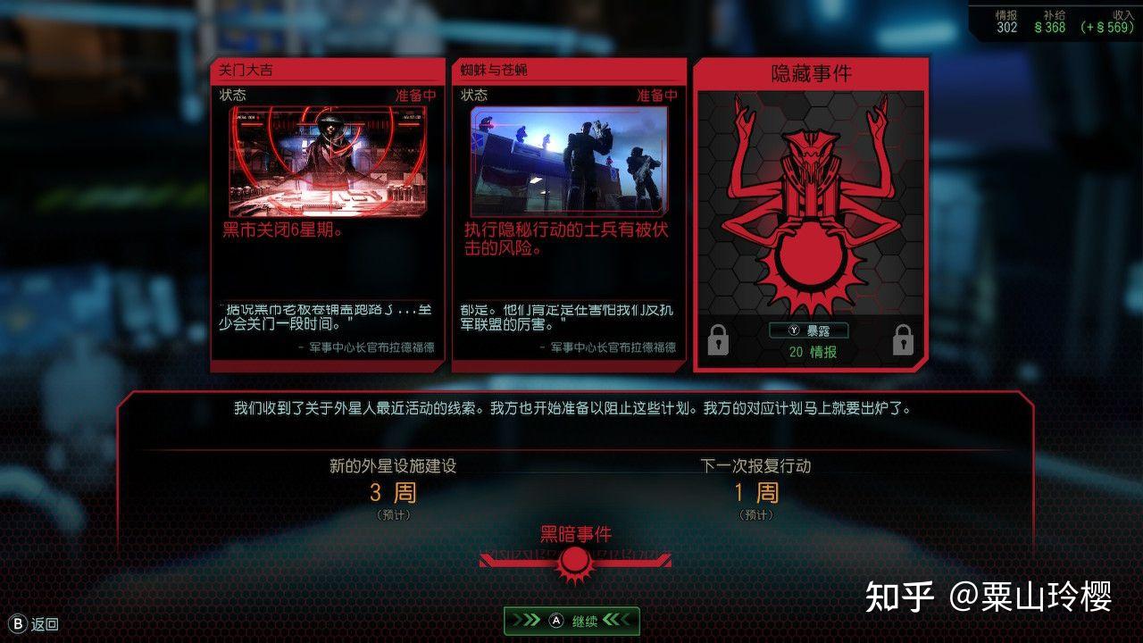 (上图是每个月理事会总结陈述,新外星设备建立3周就代表下一次化身方案还有3周就会增加一点,下一次抨击动作则是未被还击的暗中事务DEBUF生效的时间)
