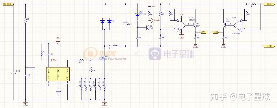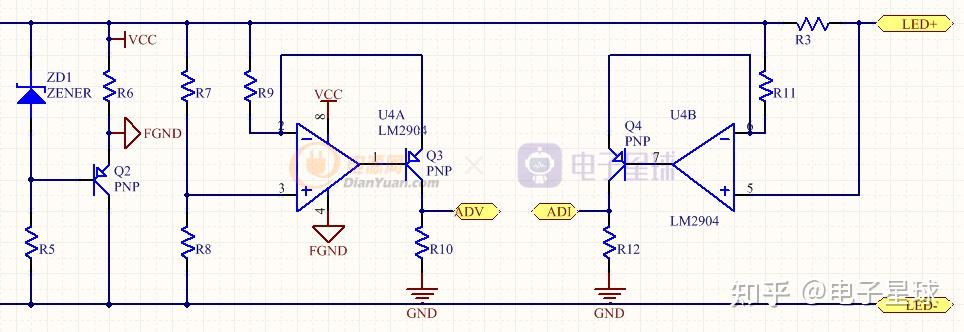 输出采样部门电路零丁列出来便于旁观每个元器件位号,阐发工做原理:若ZD1取稳压值为10V的稳压二极管,Q2为PNP三极管,此时导通且Vbe=-0.7V,由此可知VCC-FGND之间压差为9.3V,用此电压给运放U4 LM2904供电,操纵运放虚短路和虚断路的特征……