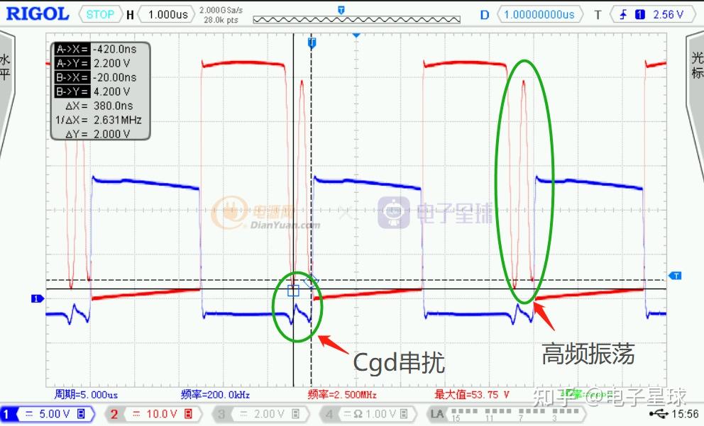 图4 400kHz测试波形固然图4中不是实正意义上的软开关,但能够发现软开关的长处,损耗降低,Vgs没有了密勒效应,开关速度加快,波形非常完美,硬开关形态,Vgs上升沿不只有密勒效应,并且上升沿波形有震荡。所以如今变更器根本都利用软开关手艺,以进步性能……