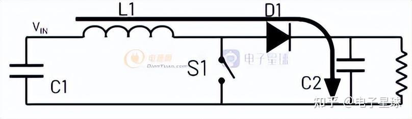 图1.异步BOOST电路工做原理,形态1图1所示为一个根本的异步BOOST电路图,能够看到次要包罗开关管S1、二极管D1、储能电感L1、输入电容C1、输出电容C2,以及负载RL等。稳态前提下,整个电路分红两个工做形态,如图1所示为形态1:S1开关管闭合,VIN电流流经电感L1到地给L1储能,后电畅通过大地流回VIN负端完毕。此时电感右侧电压为0,二极管反向截至,因而,负载RL的电能完全通过输出电容C2供给。