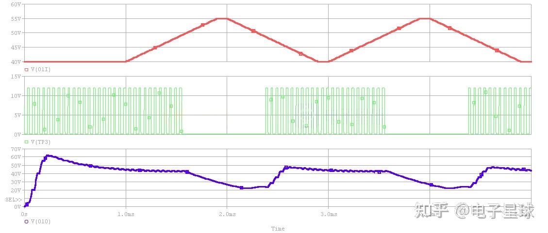 瞬态仿实设置:Duty=0.6测试波形和数据如下图所示:等效输出电压高于49.181V时驱动封闭、输出电压V(O1O)降低,等效输出电压低于48.715V时驱动开启、输出电压V(O1O)恢复一般、约为40V=24/0.6,庇护电压滞环范畴约为466.591mV