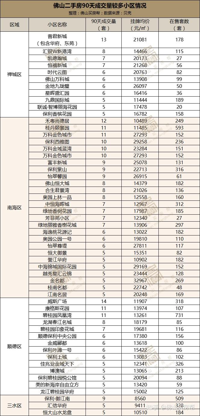 据贝壳数据显示,近90天成交TOP10小区鲜明满是1字头,双位数那种的,大多集中在顺德、南海。