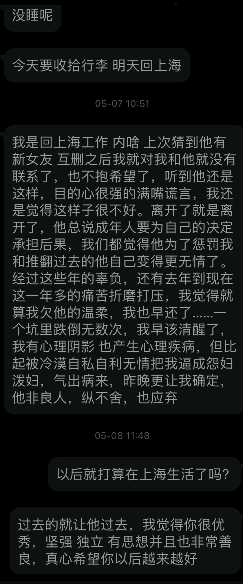 事实也是如斯,喜好我的人照旧存在,但是总能被我的冷漠现实和不定性的忽冷忽热的性格击退掉,各人似乎都是各取所需,或者浅浅的试探付出相处着。其实他在2020年的十一月发给过我一条碰头的信息,因为我工做太忙(那时候确实很纠结,第二天的工做很重要,我不去不可,而我也告诉他了)当天没有去见他,然后我们后面就实的再也没见了,也许他不想再影响我太多吧。他丢下一句敷衍我的话:“ 我今天临时有事儿忙,等下月到上海再碰头哈,你先好好赐顾帮衬本身。[浅笑][拥抱]”