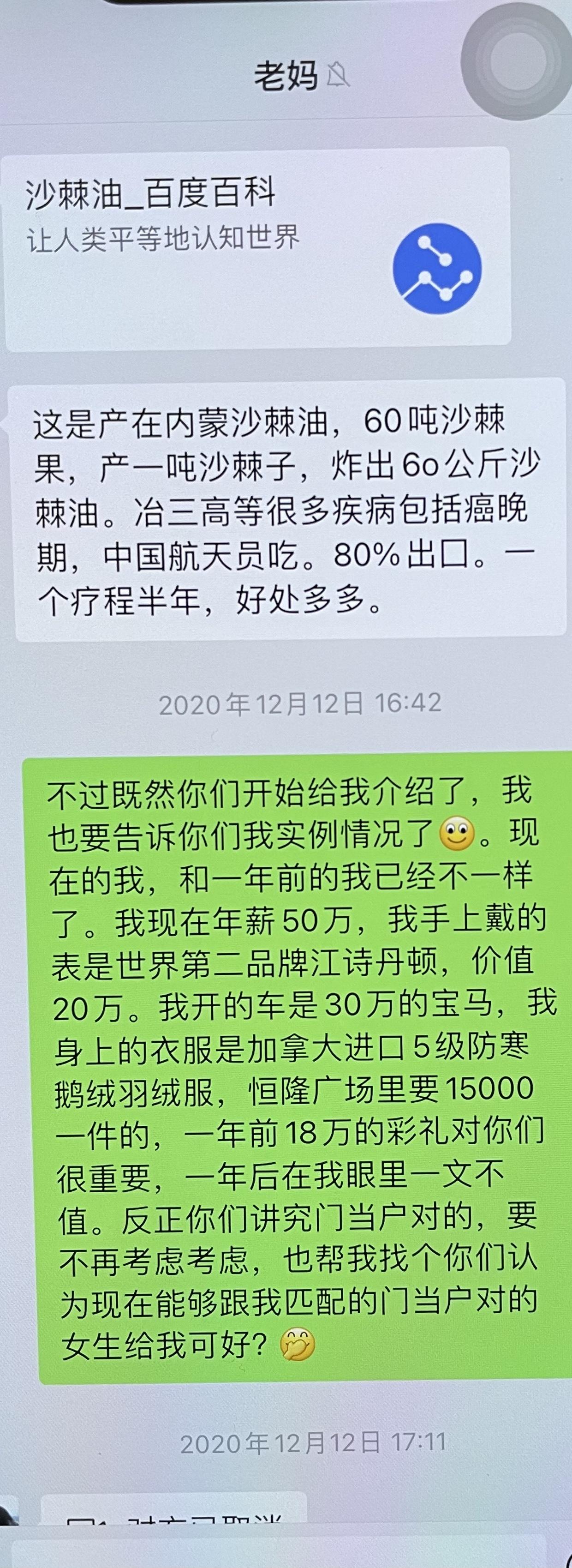过年回家后面临家人的催婚,我说我有一个正在领会中的男士,并给家人简单介绍了他的情况,有车有房有本质,有工做才能并绅士的上海土著。家人听后之一句话就说人家不成能看上你的,人家那么好的前提。别跟他浪费时间了,我不平气。我试图邀请相亲男来我家一趟,见了面我家人必定就晓得他单纯诚恳没有那么高屋建瓴了。但是关于我的表示,不晓得是他实不懂仍是拆不懂,就失败了。