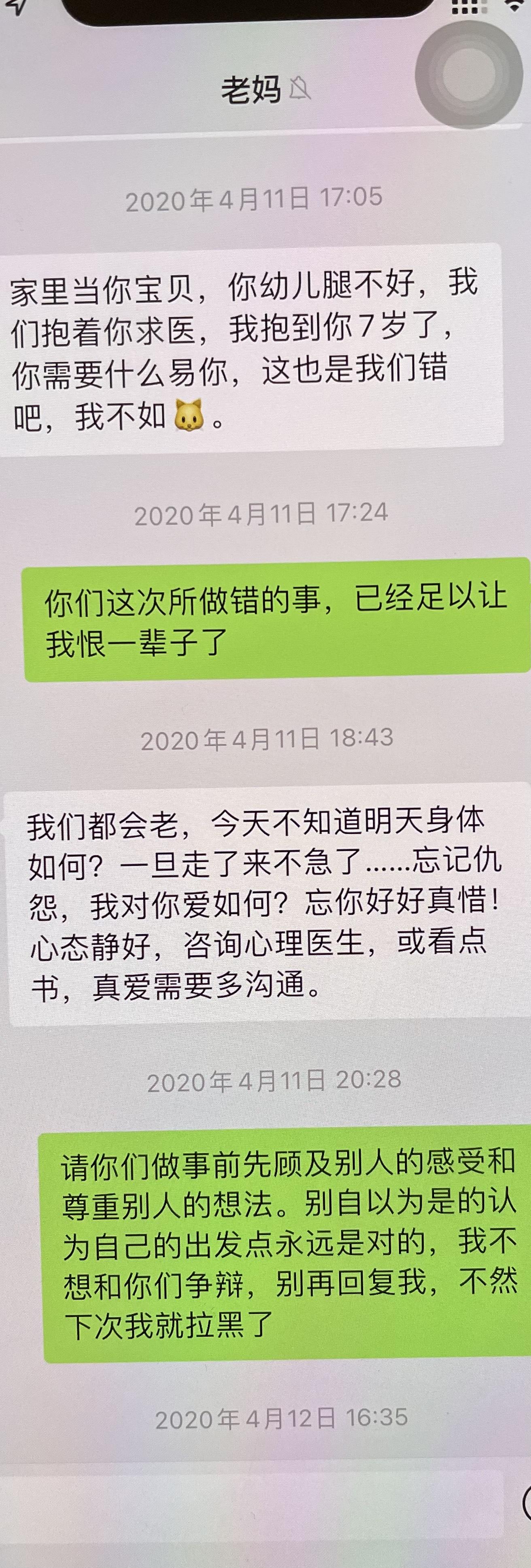 他说爸妈做的饭难吃,他喜好吃外卖,40岁了还啃老。我看到他发给父母的一些聊天记录后,还有一部门他说他爸爸恶心的微信删掉了,挺心寒的,我问他父母做过最让你打动的工作是什么?她说妈妈把我抱到了八岁。爸爸什么玩具城市给我买,奶奶有一次全身淋湿了接他下学,衣服都给他当雨披,回来后奶奶都伤风了,是的他奶奶在他上初中的时候还接他上下学,临死前把生前所有财富都留给了孙子,奶奶到死才想到是死于本身宠嬖至极的亲孙子,很可怜也很可悲!他既然晓得父母对他好,为什么还要如许狠毒?他莫非理解不了得过病70岁父母的心吗?乌鸦有反哺之意,羔羊有跪乳之恩.那是连动物都晓得的恩情啊?而且对父母如斯差的人对我的好又能对峙多久呢?