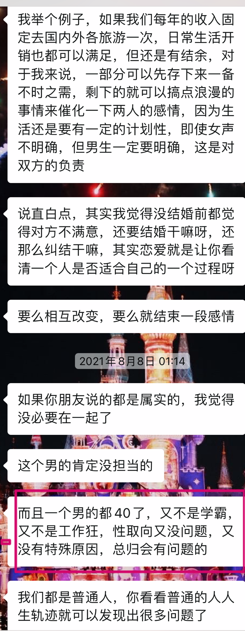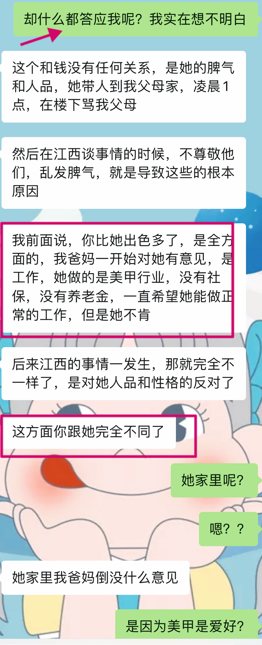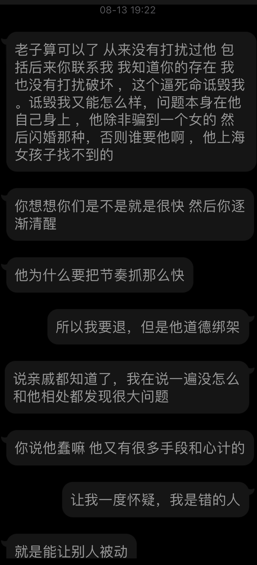 其实我们中间也是争论不竭,因为之前没有同居过,后面在一路了才一个礼拜我就觉得怎么如斯狗血奇葩?无法和他继续,觉得每天都被小工作气死,固然发信息 *** 他他也不懂我说的话什么意思所以不晓得咋回,(下图)有一次我其实无法和他同在一个屋檐下生活,我把他赶进来住了,因为再住下去我就得起头对他脱手了,我不想那样,又惧怕控造不住本身,我对他说我们暂时沉着几天,他在外面的几天,他每天盼着回家的日子,但竟然一条信息都不给我发,反却是给我伴侣发信息说:今天她怎么样了?什么时候让我归去?就仿佛一个等着被宣判的死囚犯一样。伴侣让他给我发,他说仍是算了,多做多错,还不如啥也不做,如许我就不会犯错误了