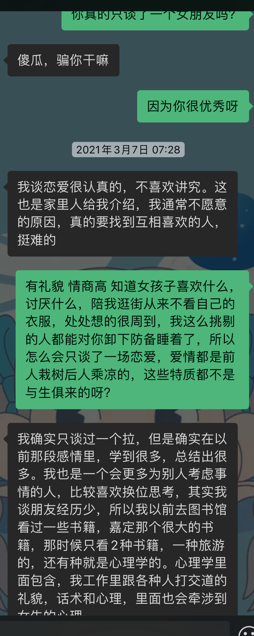 那是我们之一次聊天(下图),他表示的很迫切,聊天也会十分积极认实,通过初度聊天我察觉出来他是一个很喜好小动物而且喜好察看小动物习性的人,固然他本年38岁,但目前也只谈过一段豪情,因为女方脾性太差,所以招致他们分手,通过他自述我领会到。