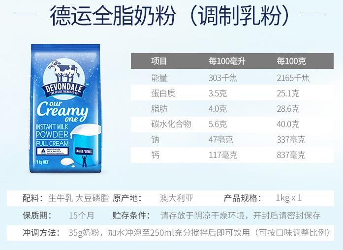 德运(Devondale)澳洲原拆进口 高钙全脂成人奶粉1kg