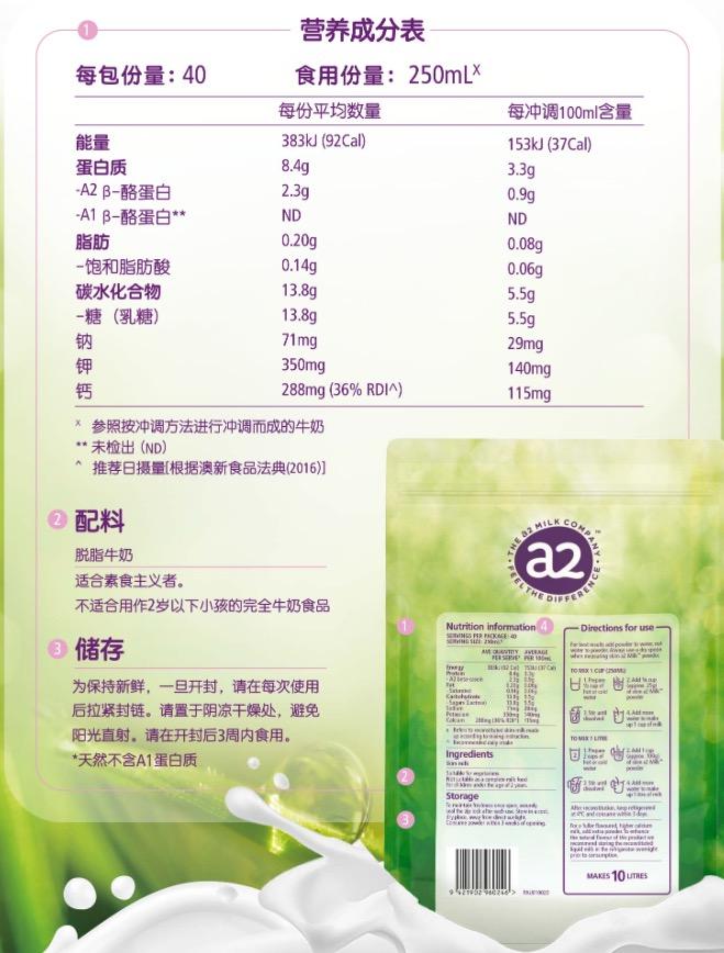 a2.脱脂奶粉高钙成人 1kg/袋 中老年儿童青少年学生速