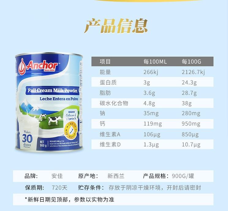 安佳(Anchor) 新西兰原拆进口 脱脂奶粉 高钙脱脂 900g