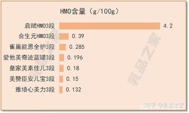 本期测评的7款跨境购奶粉中,启赋3段含量更高,每100克奶粉HMO含量是4.2克。