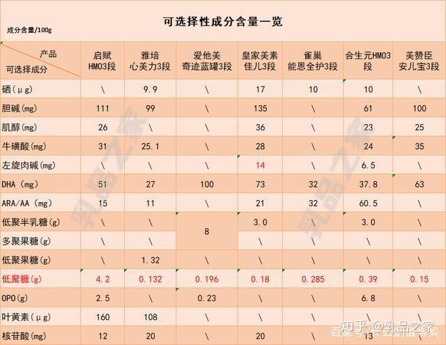不外阐发营养成分显然不克不及只看个数,还要看各项营养成分的详细含量。经统计,七款奶粉的各项可选择性成分详细含量如下: