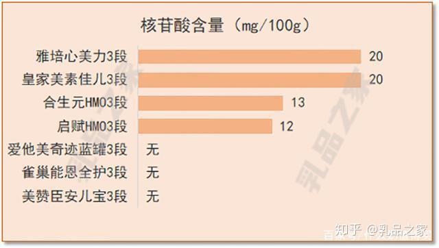 ①有助于婴幼儿进步免疫力的核苷酸,含量更高的是雅培心美力3段和皇家美素佳儿3段。未添加核苷酸的是爱他美3段和雀巢能恩全护3段、美赞臣安儿宝3段。