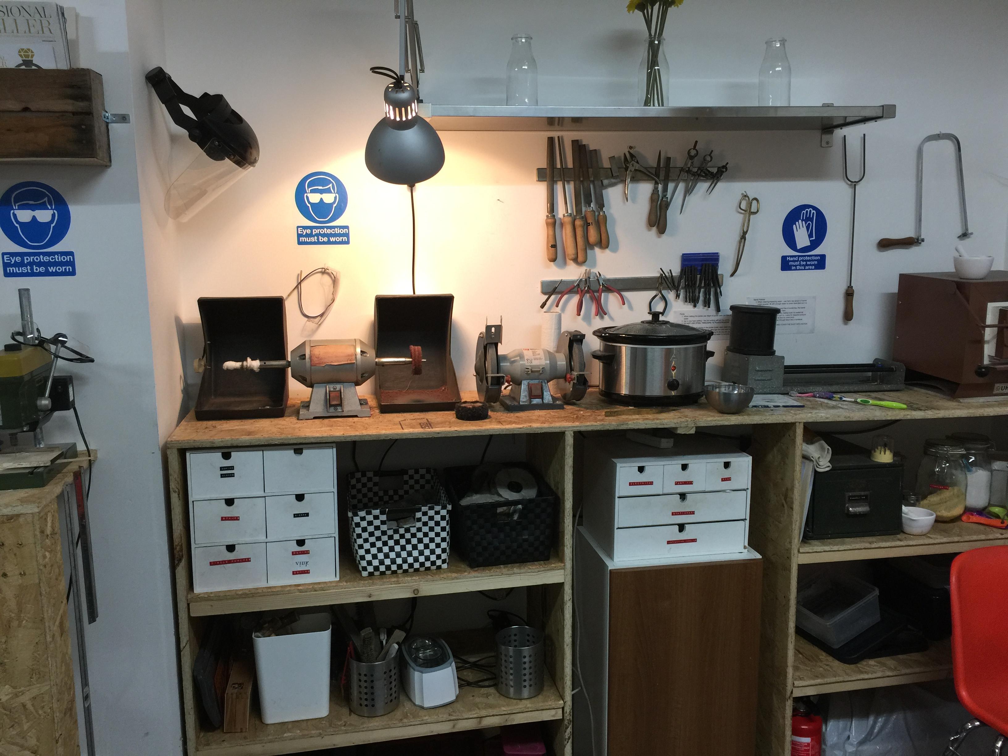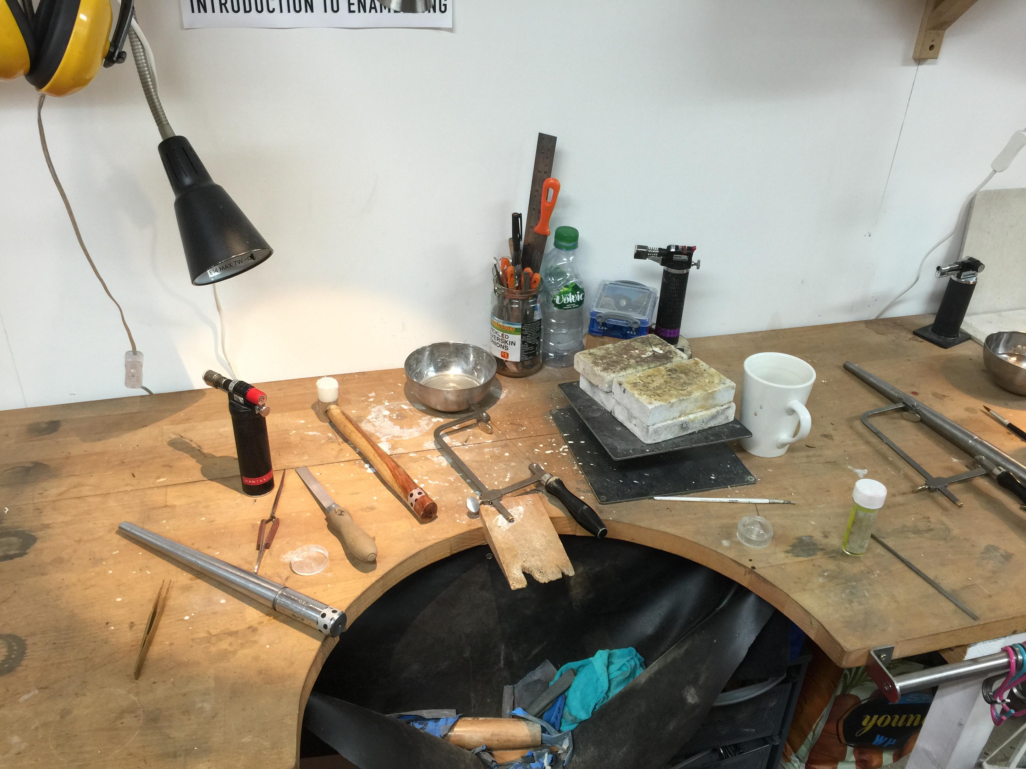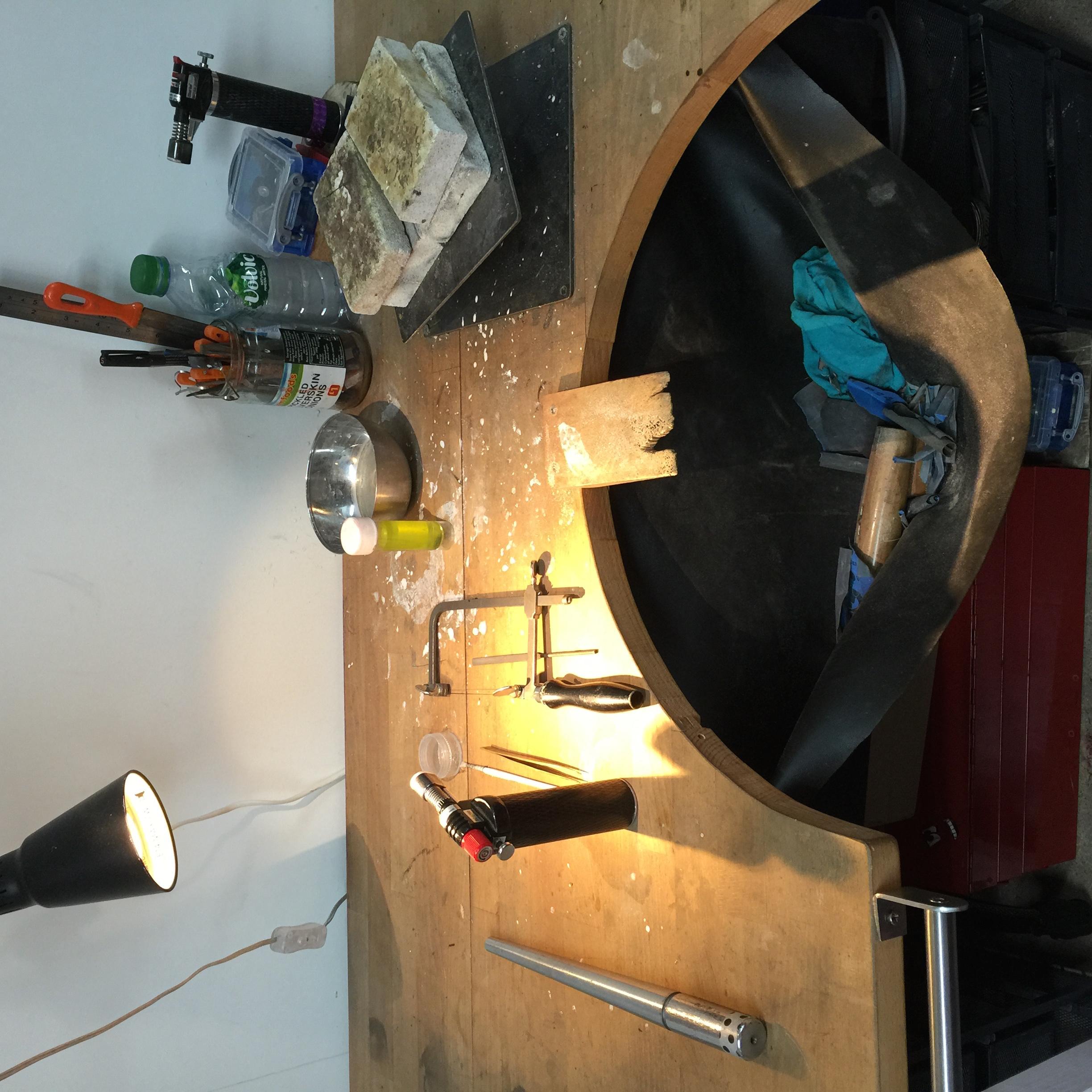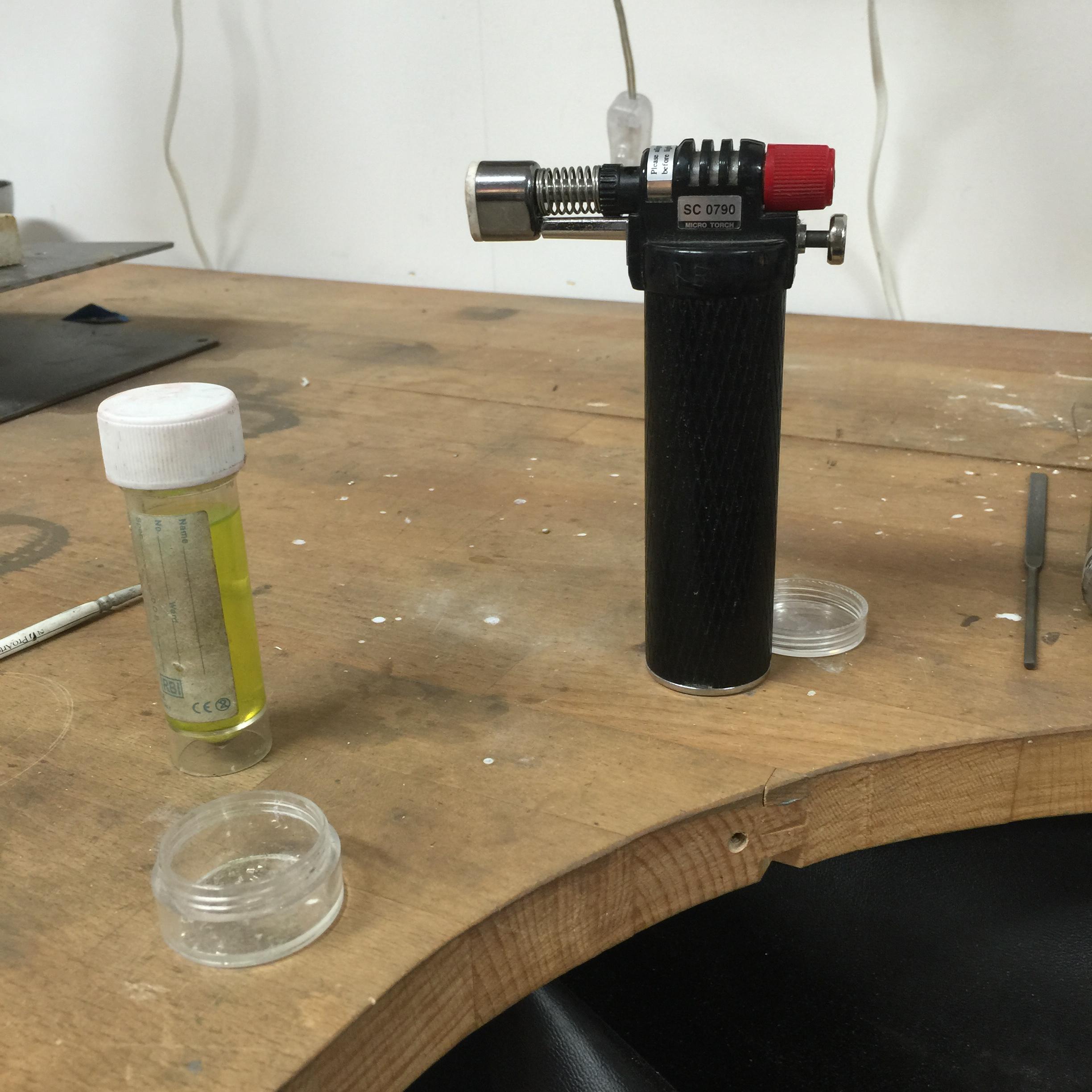 那是我的工做台的正面特写,半圆形凹槽上面的木头是工匠的好伴侣,什么工具都要抵在上面做。从左往右依次是戒指尺寸棒(Ring Gauge Mandrel Sizer Stick),焊接枪(heat gun), 做首饰用的小型线锯(Jeweller Piercing Saw Frame)