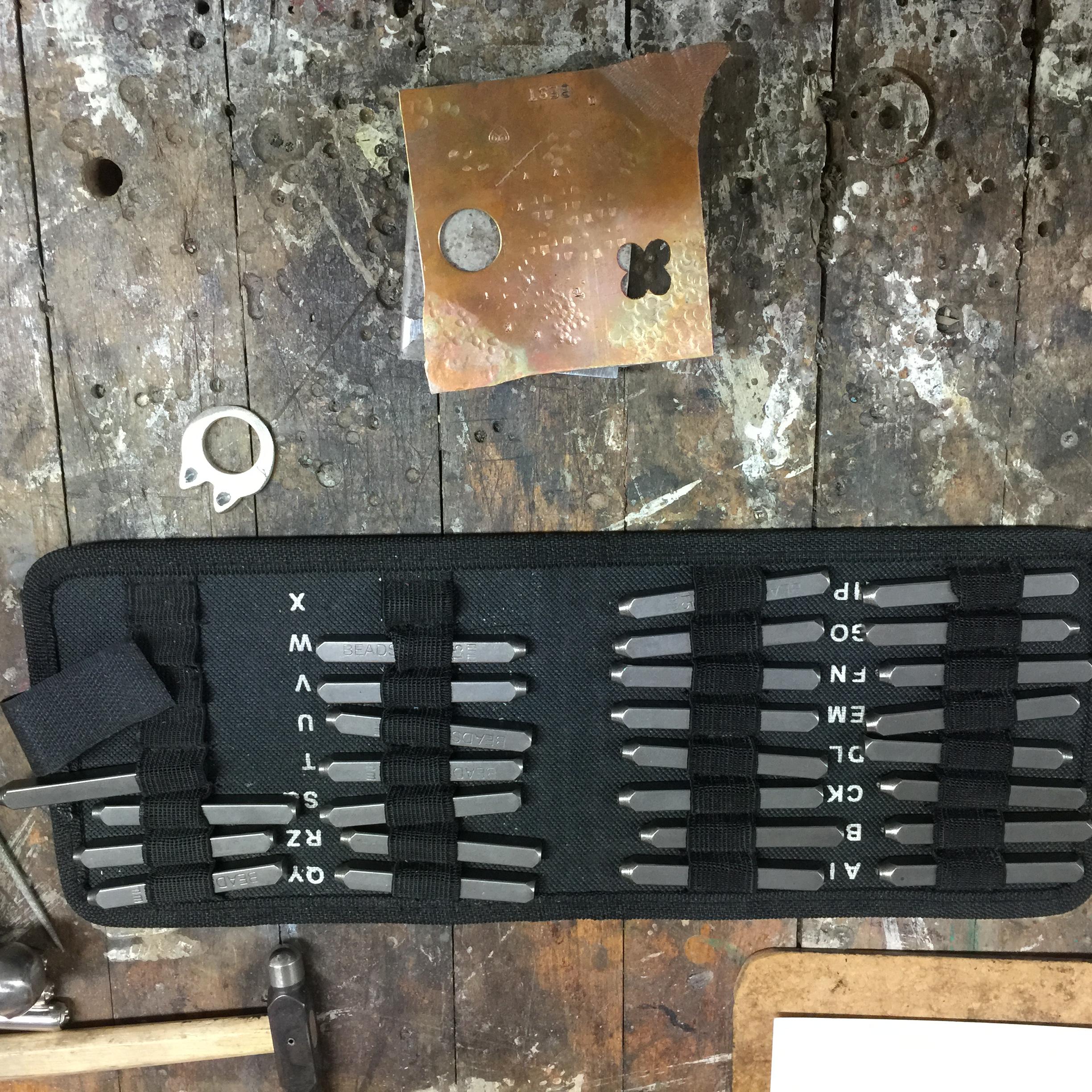 用圆形矬子打磨戒指的毛糙和尖利的部门,然后用beads *** ith牌的字母套件(steel alphabet set),把戒指套在尺寸棒上,用锤子敲打字母套件,更好一个字母只敲一下,否则字母会打花。最初用砂纸和机器打磨外表做故意仪的涂层和匀整的外表。