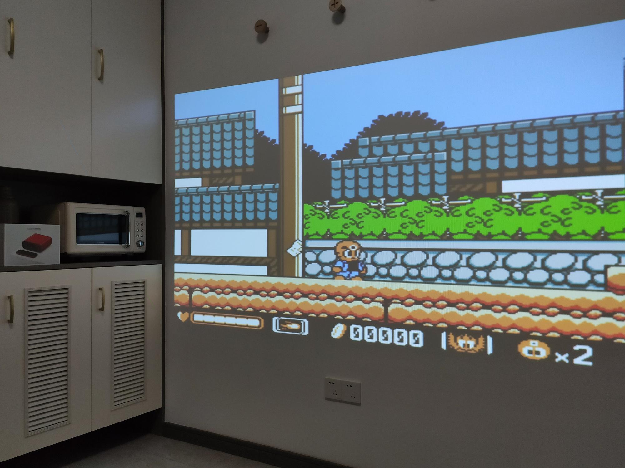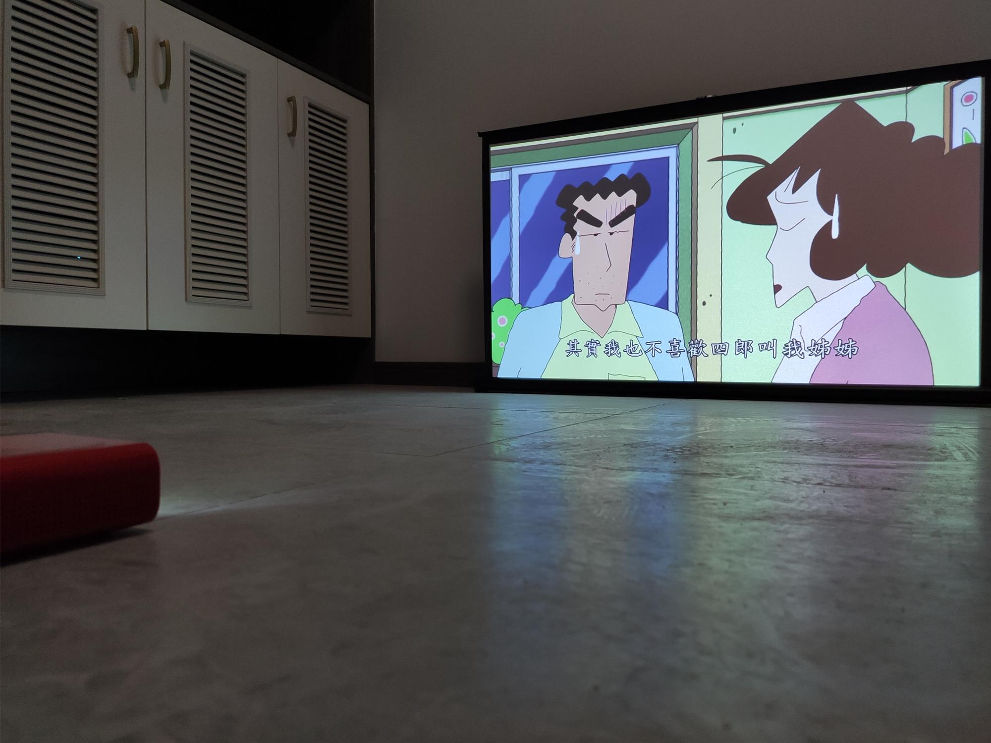 别的,投影仪那类产物离被投射墙壁或者幕布越远也就可以投射出更大的画面来,那一点关于被屏幕尺寸固定的电视机而言,很明显投影仪的优势更大,可以为所欲为自在调整投影画面的大小。上图的投影效果就是将“小红盒”向后挪动一点间隔后能够明显看到投影画面变得更大了。