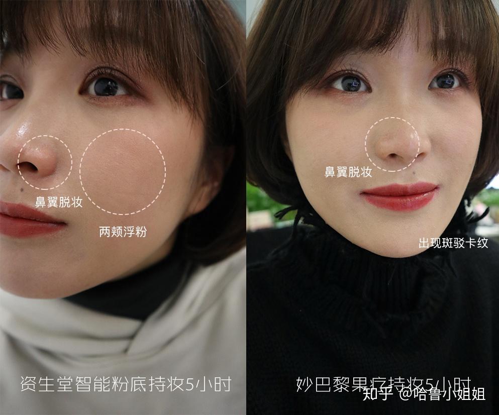 持妆时间一久就会发现仍是有些许不同的,我是个混油皮,一般城市呈现脱妆的情况,资生堂智能粉底固然也有浮粉情况,但整体算是比力轻细,妆效大致没变,妙巴黎妆效则不尽如人意,靠近我1米以内根本能看清所有纹路,是必然要补妆的。