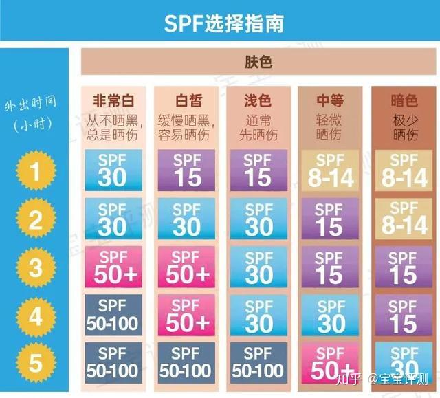 越高,确实抗晒伤和抗晒黑才能更佳,更能庇护皮肤。但是要留意,防晒指数越高,油腻感越重,容易影响肌肤新陈代谢,引起毛孔梗塞、长痘等现象。建议按下图的SPF选择指南,按照本身的肤色和外出时间选择SPF值。
