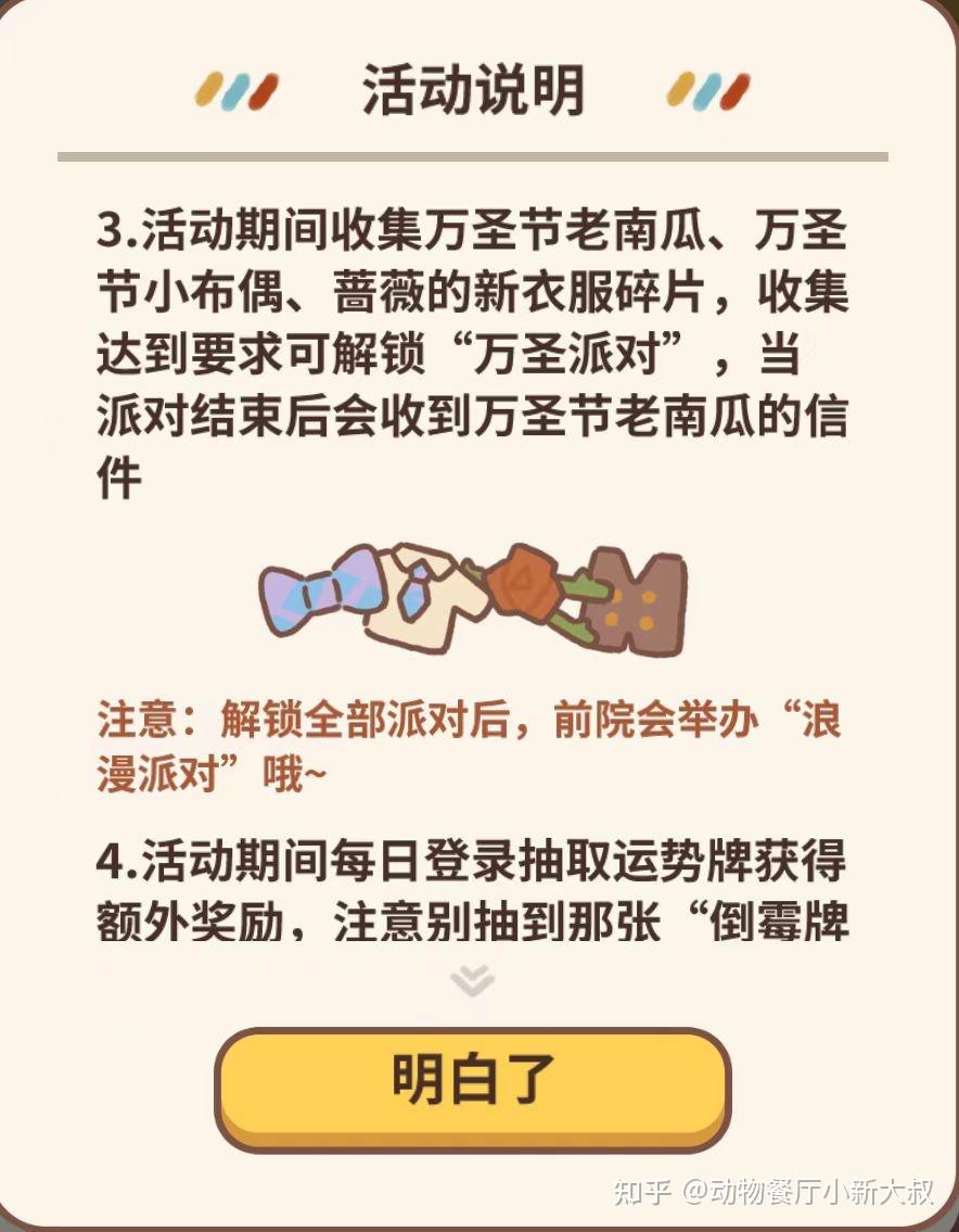 起首活动的入口在餐厅页面的右上角活动时间是从10月28号的早上6点到11月11号的早上6点活动的弄法其实仍是去两年差不多仍然是搜集掉落物拼集完好的衣服,然后开派对