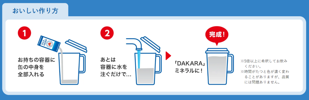 现现在,无论是中暑、入睡、洗澡、饮酒、运动,仍是办公前后,日本人都有喝电解量饮料的习惯。[5]