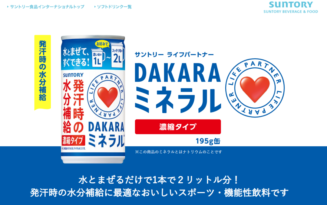 三得利浓缩型防中暑饮料,一罐能够冲兑2升液体图片来源:三得利官网防中暑饮料DAKARA只是三得利饮料产物线的一个分收。而在意识到盐汽水在季节上的局限性后,国内的盐汽水品牌凡是的做法是一边维持盐汽水产物原有的优势,同时也积极研发其他品类的新产物。
