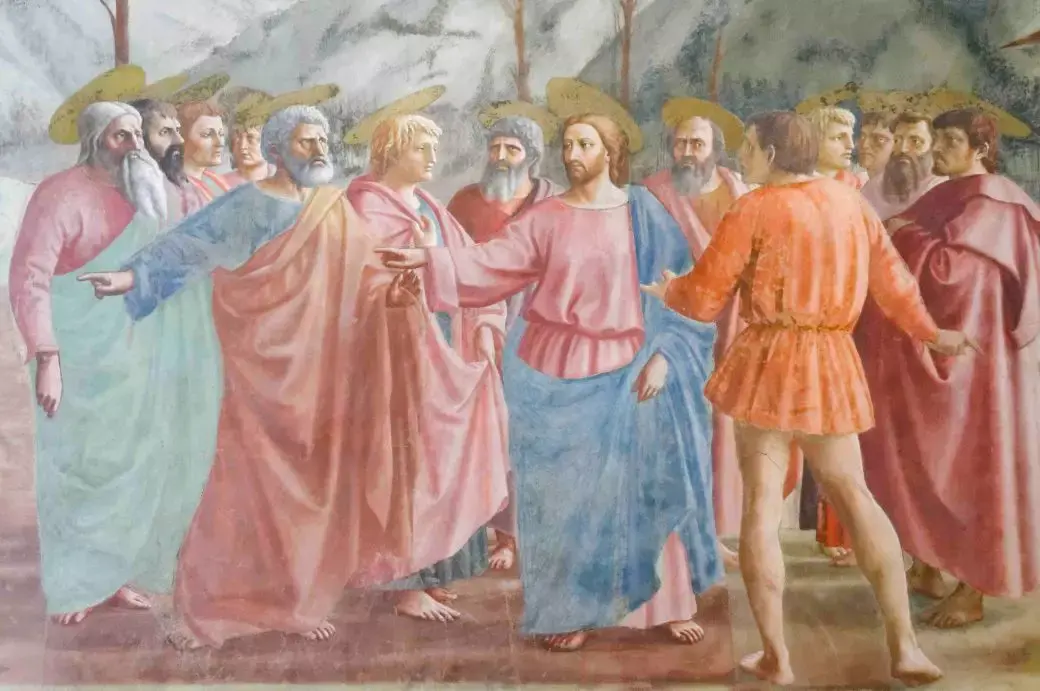 图16. 圣彼得将税金交给税吏,《交税金》(部分) | 图片来源: *** 圣经中那一故事从中世纪起头就不断被世俗政权做为挑战教会权利的根据,它明显具有“天主的归天主,凯撒的归凯撒”的意味,即使圣主耶稣,也该遵守尘世的规定,向世俗政权缴纳税款。若是我们留意到此画创做的时间,就能够晓得它是一幅借宗教题材表示佛罗伦萨共和国现实政治的画做。因为从15世纪初期起头,佛罗伦萨不断不能不面临相对强大的米兰公国的入侵,为了克制战争所带来的庞大破费,1427年佛罗伦萨共和 *** 起头对公民停止财富审查与注销,并以此为根据按财富与收入停止纳税,意大利语称为catasto,关于现代税收轨制来说,毫无疑问,那是一个影响深远的创举。关于生活在佛罗伦萨共和国境内的上帝教僧侣,根据中世纪的法令,他们能够没必要向世俗的共和 *** 缴税,但后者无疑希望突破那一古老传统向境内的上帝教僧侣停止纳税。