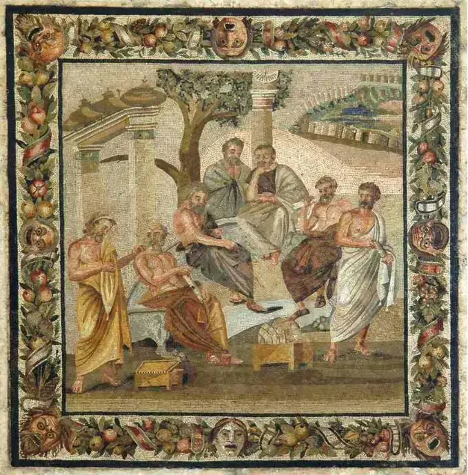 图20. 柏拉图学院,彩石马赛克,古罗马,公元前100年-公元100年,高86厘米, 宽85厘米,现陈列于拿波里国立考古博物馆 | 图片来源: ***