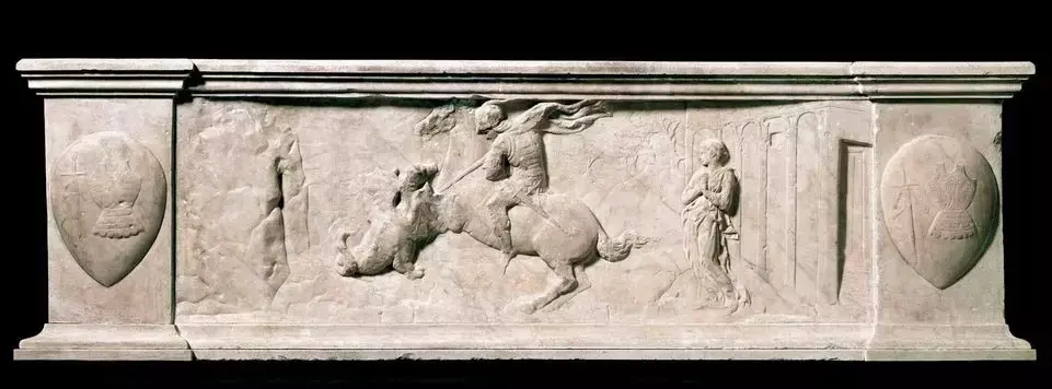 图18a. 多纳泰罗,圣乔治屠龙,大理石浮雕,圣乔治立像基座,高39厘米,宽120厘米 | 图片来源: *** 若是说透视法的应用也在某种水平上是基于对天然的察看,马萨乔的绘画做品仍然是乔托在绘画范畴创始的天然主义的进一步开展与深化。那么画家在绘造此画时对古代希腊-罗马艺术的继承与运用使得那一做品成为艺术史上之一幅狭义的文艺复兴绘画。