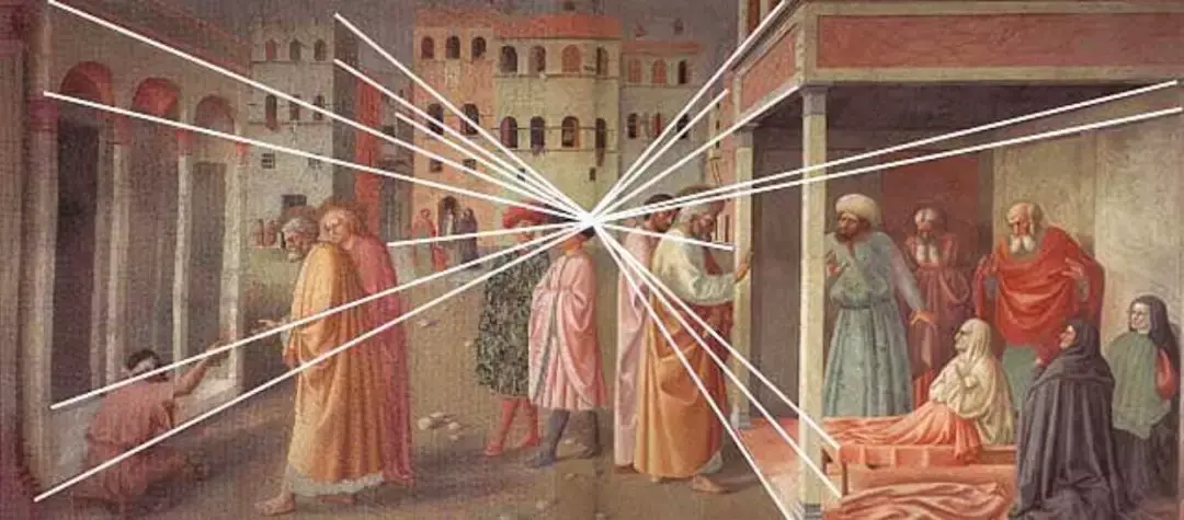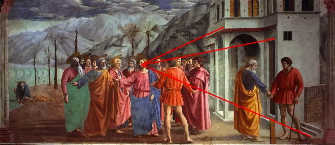 马萨乔的那幅做品是天然主义与科学主义的完美连系:画家接纳了布鲁内莱斯基刚刚创造的透视手艺,画面的整体设想为单点透视办法(图17),整个画面的聚焦点为耶稣头部,为了便于让不雅画者易于理解那种新透视办法的应用,马萨乔在画面右侧绘造了一系列建筑;而画的右边,正在垂头从鱼嘴中取钱的彼得的脸部,画家用了正前缩距透视法(foreshortening);为了加强画面景深,画家用了色彩变革透视,那种透视办法在古代中国画中也有应用,但马萨乔对那种透视手艺理解的来源应是多纳泰罗在浮雕创做中所用的分层雕琢透视法(Stiacciato)。