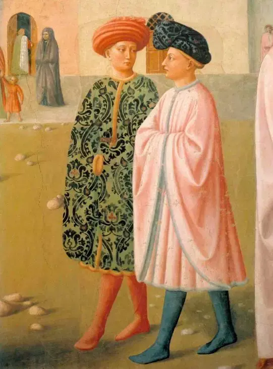 图28. 马索里诺,身着华服的一对人物,图27部分 | 图片来源: *** 一件有趣的工作是,在瓦萨里的列传中,将那幅画做准确地定为马索里诺的做品。然而,在整个19世纪到20世纪的前几十年里,艺术史学家们却认定那幅壁画是马萨乔的做品,约1930年时人们从头认定它的次要做者为马索里诺,但仍有一些艺术史学家与评论门风称,马萨乔绘造了此中一部门,有人建议画中的整个建筑和周边情况以及布景中的人物都出自马萨乔的手笔,几乎所有学者都承受那一理论。但按照1980年代修复壁画时的发现,我们能够操纵现代图像阐发手艺确定那幅画做完全没有马萨乔的任何手笔。关于曾经数次到此察看的笔者来说,马索里诺的那幅绘画与马萨乔的《交税金》有着几乎同样的艺术传染力与张力,而源自传统哥特艺术的粉饰性为画做增加了几分雅丽与豪华,虽然其画中人物也许没有马萨乔画中的雕塑感。