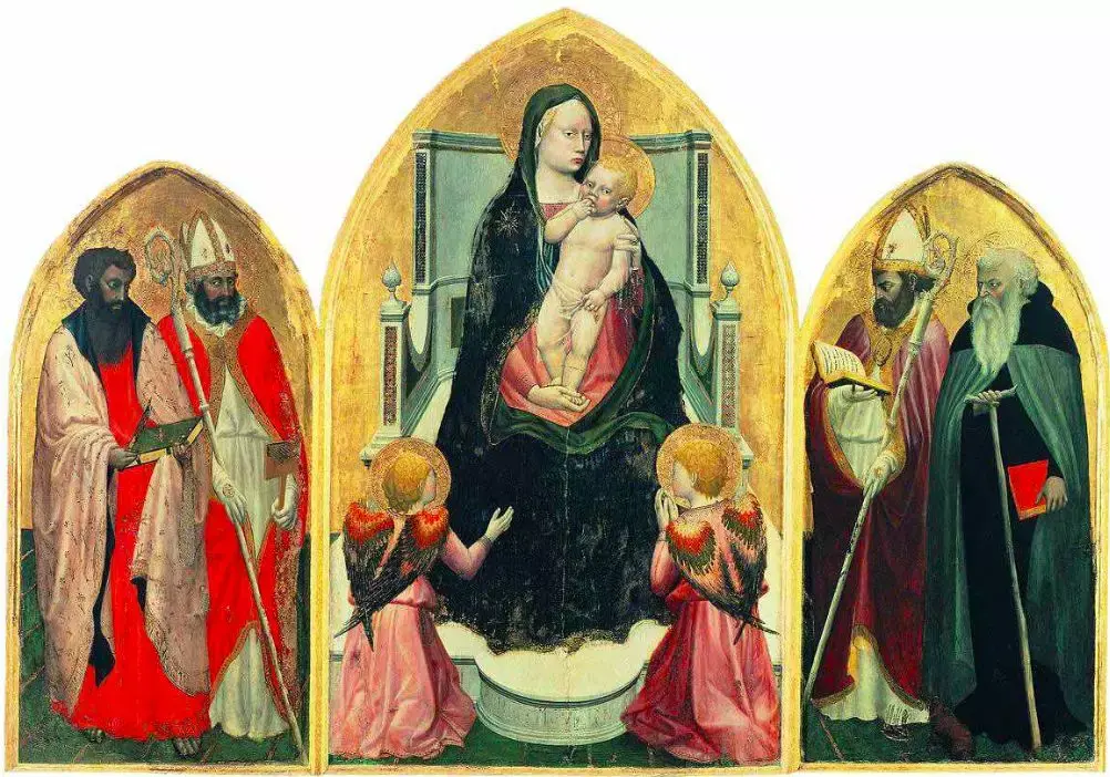图13. 马萨乔,《圣·乔文奈尔三扇屏》,木板蛋彩画,1422年绘造,中间屏:高107.9厘米,宽66厘米;两侧屏:高87.2厘米,宽43.7厘米;现陈列于佛罗伦萨附近的卡西亚·迪·雷杰洛(Cascia di Reggell)博物馆 | 图片来源: *** 2.2. 布兰卡契小礼拜堂