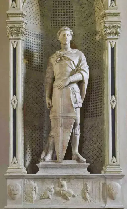 图18. 多纳泰罗,圣乔治立像与基座浮雕圣乔治屠龙,大理石雕塑,1416年-1417年造做,雕像高209厘米;基座浅浮雕高50厘米,宽172厘米;现陈列于佛罗伦萨差人署博物馆 | 图片来源: ***