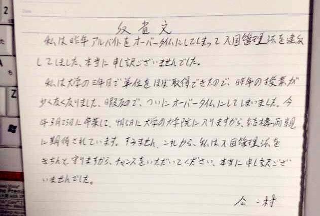 2014.3.20↑后代说,他只超了几个小时,就被日本入管局逼着拾掇行李走人,找了学校指导去求情后入馆让他写了包管书,包管没有第二次,一超时就遣返。