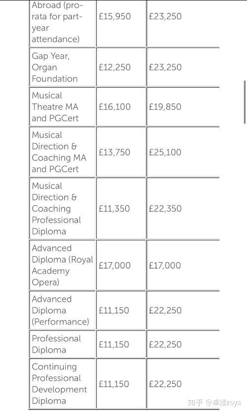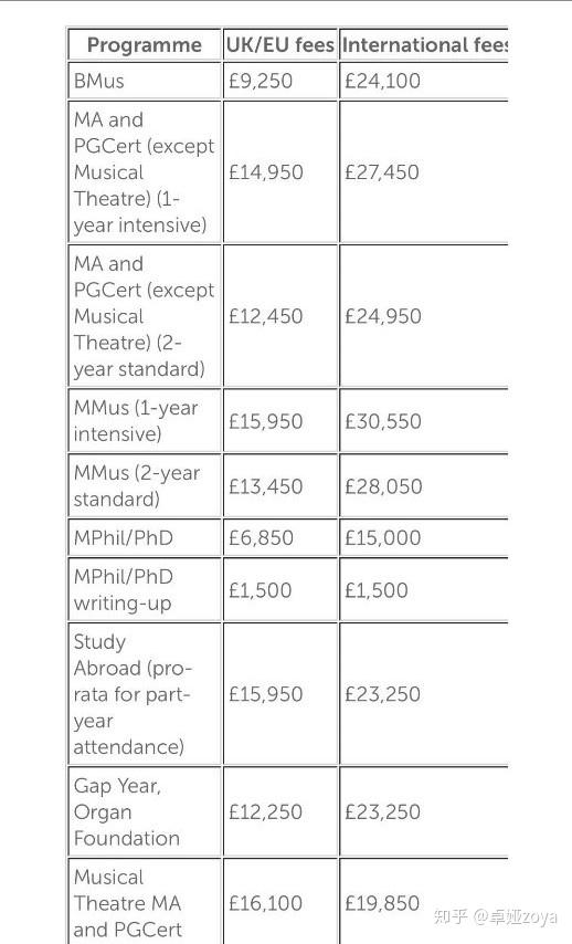 2018英国音乐学院排名伦敦大学皇家音乐学院膏火收费如下表,官方给出在伦敦的生活费用12500英镑每年。