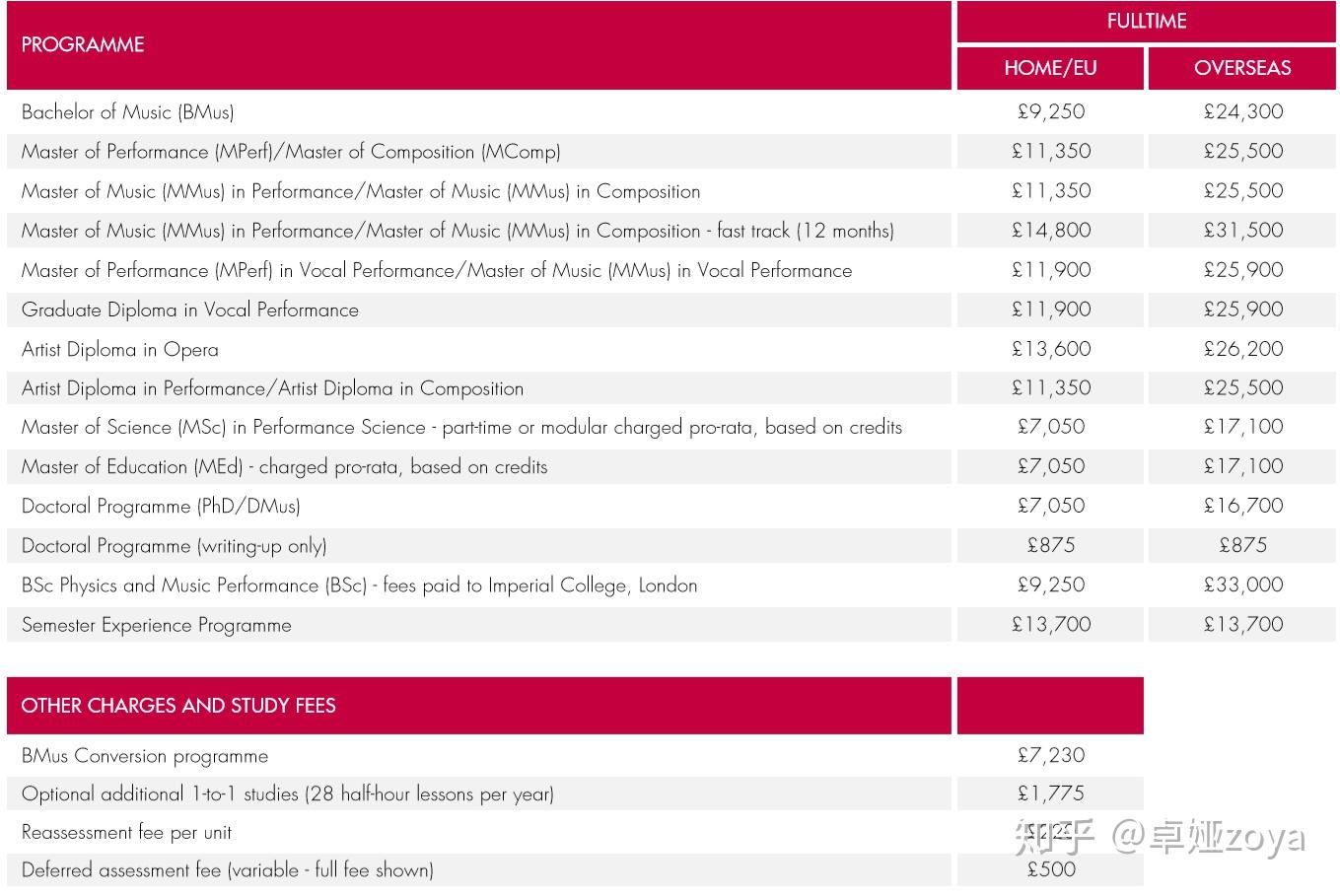 英国皇家音乐学院的收费尺度如下表,研究生的膏火有高达31,500英镑的一年学造,在膏火中能够说是比力贵的了。