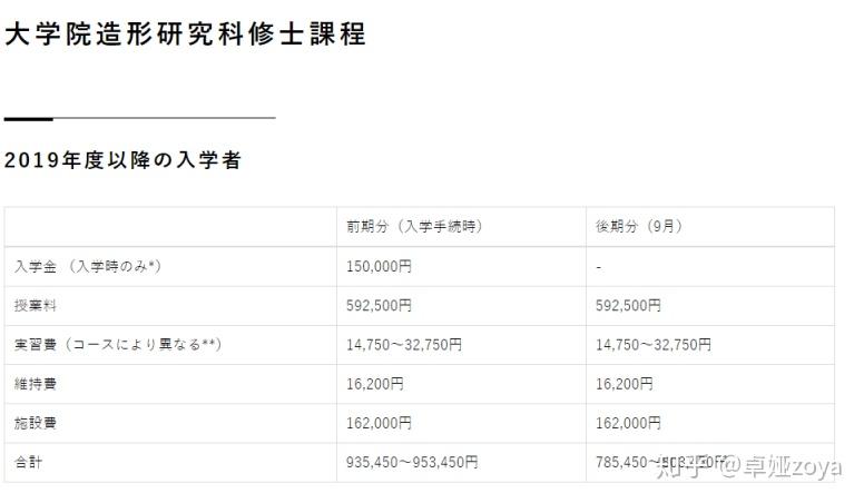 适才我们看了一下公立大学,那么私立大学以多摩美术大学为例。多摩美术大学除了适才我们说到的膏火入学金、以及保险活动费用以外,还增加了设备费用、学校维护费用以及项目活动费用。好比说相关的纯艺术类课程,如版画课程,陶瓷玻璃类的课程等等,那一些系列的课程需要耗材费用,设备费用都是需要算进我们的膏火中的。合计两年的膏火1187000日元,加上其他学杂费用到达将近350万日元,折合人民币膏火相关费用约24万人民币。