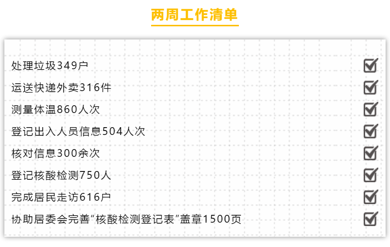 下沉的“青年突击队”由95%的90后法警构成,自6月15日下沉以来,他们持续以丰满的斗志投入到疫情防控工做中,两周下来,从疫情前线寄回了满满当当的工做清单。