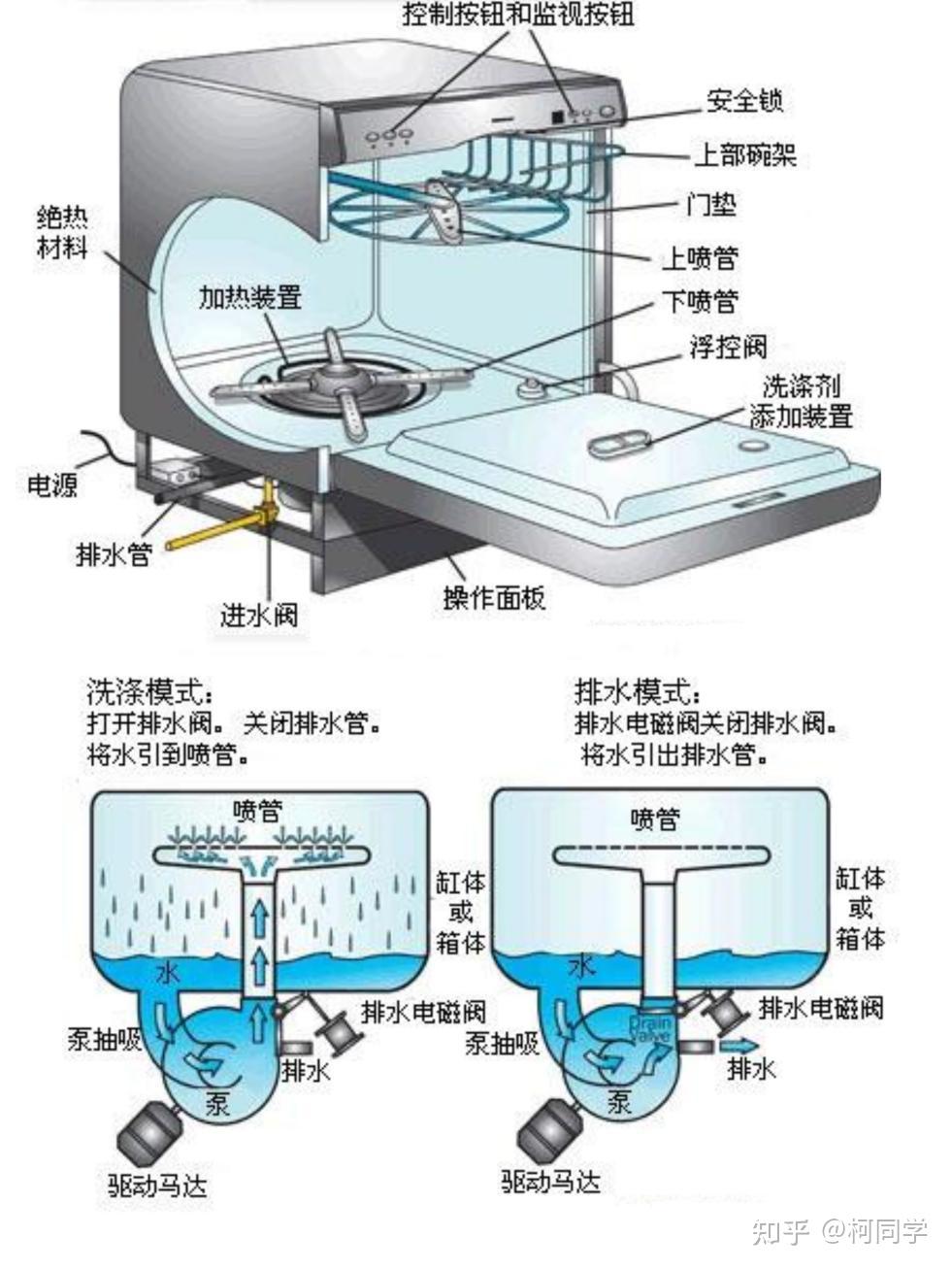 四、工做原理及内部构造遍及洗碗机的工做步调为: