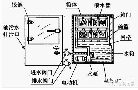 图示为小型洗碗机构造,上部由不锈钢造成的箱体和门板构成,箱内设有三排喷水管及双层碗篮,下部为水箱,内拆电热管,水箱上层有过滤网。