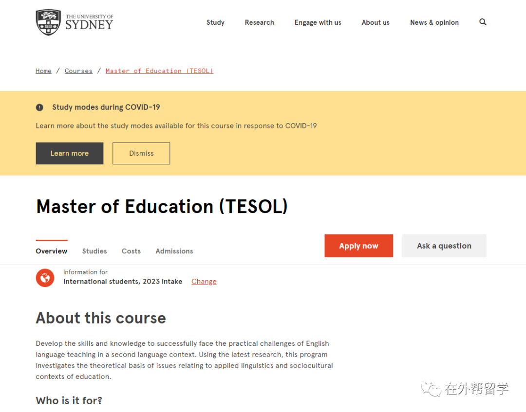 1、悉尼大学学士学位或同等学历,以及研究生英语语言教学资格或至少两年全日造英语教学经历;