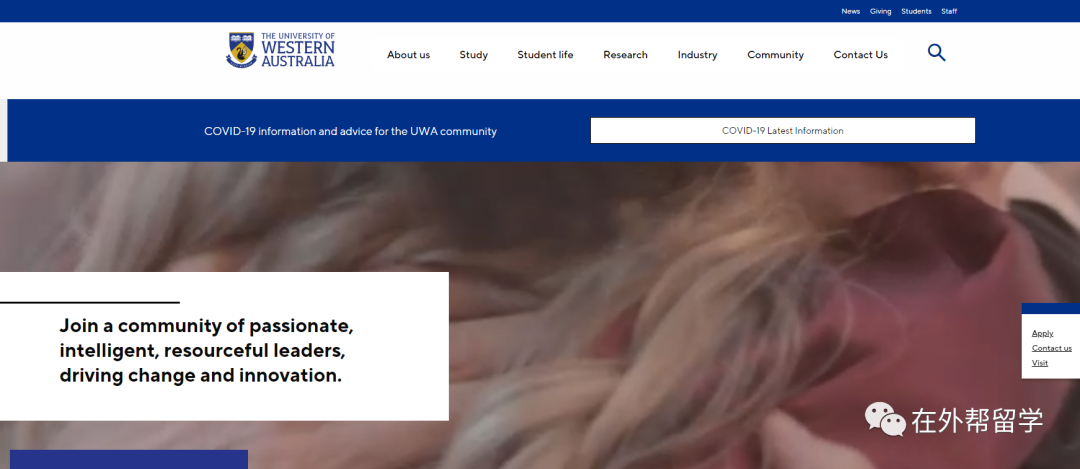 西澳大学(UWA),始建于1911年,坐落于澳大利亚西澳大利亚州首府珀斯,是出名研究型大学,澳大利亚更具汗青、代表性和实力的研究型大学之一 ,澳大利亚八校联盟、六所砂岩学府之一,世界百强大学。