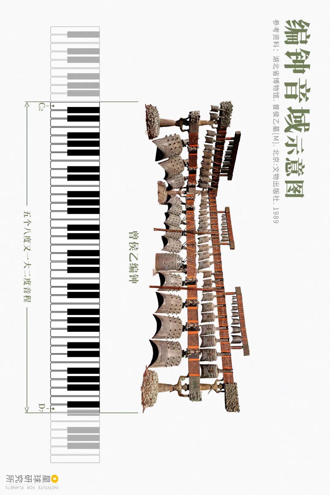 请横屏旁观,叶家山墓地M111编钟,为我国已知年代最早的成套编钟,图片来源@随州市博物馆,造图@杨宁/星球研究所而曾侯乙所处的战国早期,编钟已进入其开展的巅峰,他将65件乐钟分为三层八组,每组均七声齐全,可独立吹奏乐曲,并以钮钟在上、甬钟鄙人为原则,以各组组内的音阶为挨次,将它们依次悬挂于铜木架上。
