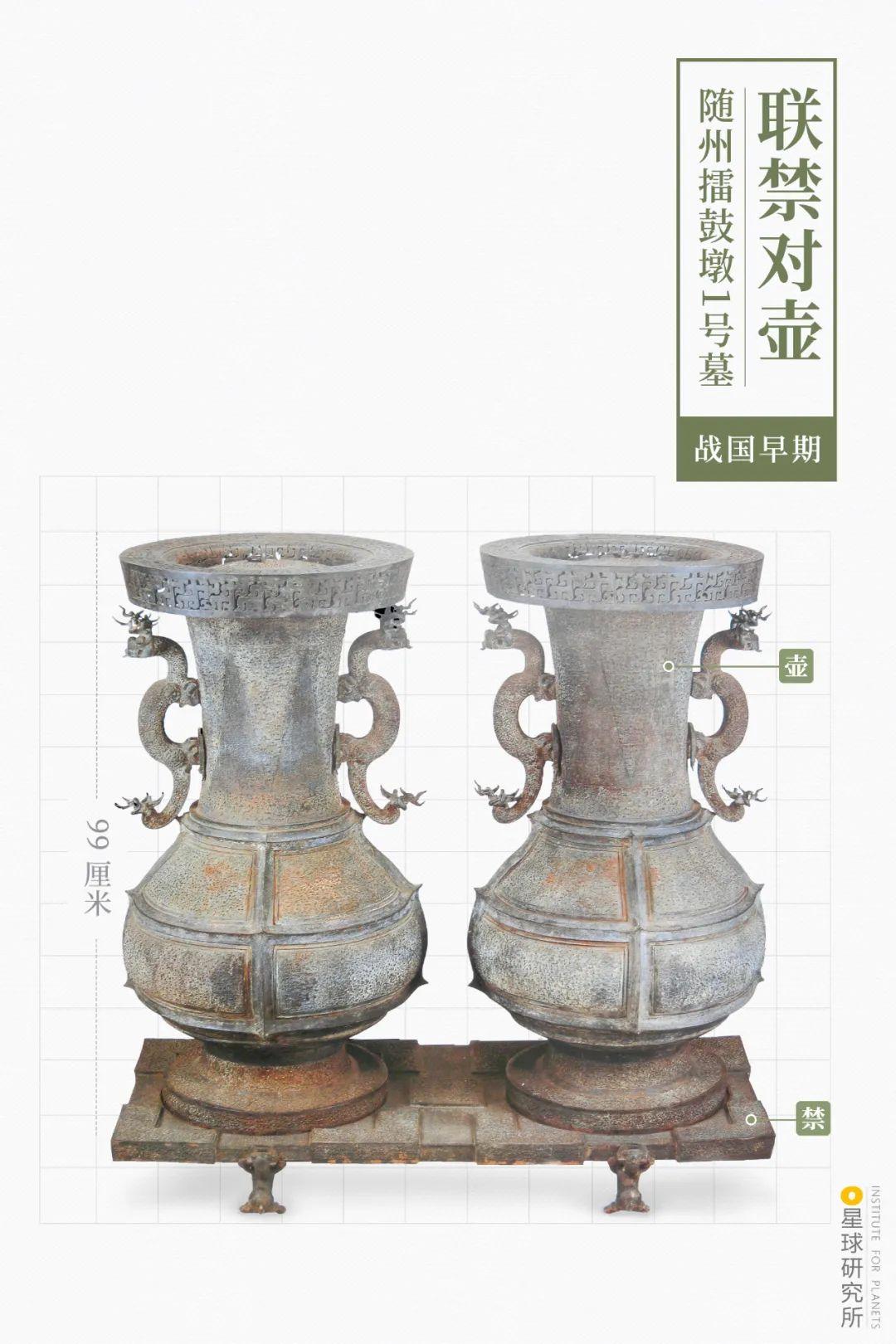 大尊缶,出土于曾侯乙墓北室,或认为其乃贮酒犒赏兵士之用,图片来源@随州市博物馆,造图@杨宁/星球研究所有设想巧妙、形如双子的联禁对壶,