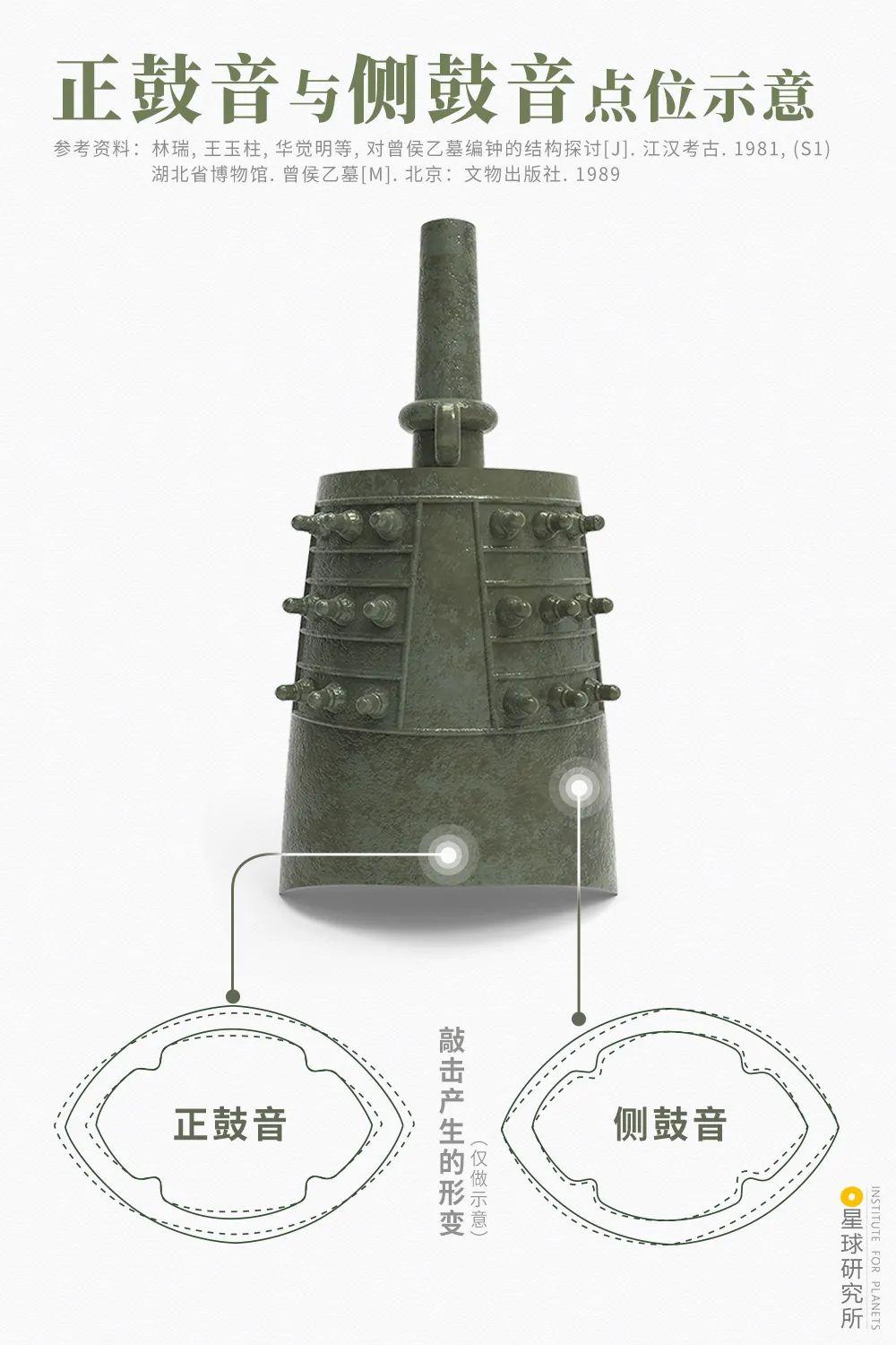 正鼓音点位与侧鼓音点位示意,差别的敲击点位使得编钟所产生的形变有所不同,因而招致音高差别,造图@罗梓涵/星球研究所“一钟双音”的存在,使得编钟可以发出更多、更广的声音,其上更是用近三千字的铭文。系统记载了包罗“一钟双音”在内的。其时的音乐学理论,堪称先秦音乐的“百科全书”。