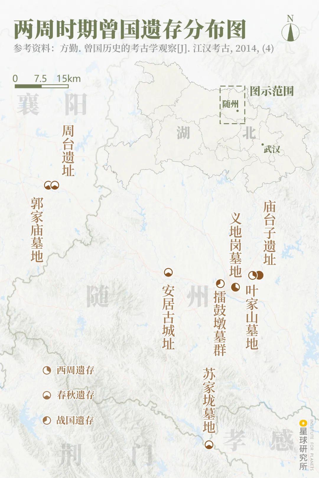 图为两周期间曾国遗存散布图,造图@泰山/星球研究所西周早期,曾国忠心辅佐周天子,屡次征讨叛逆的诸侯及部落深受王室倚重,因其位于汉水以东,故又号称“汉东大国”。