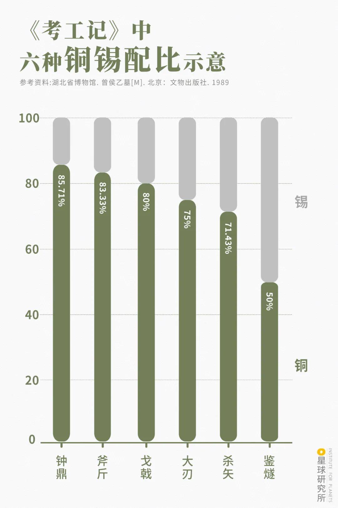 《考工记》中六种铜锡配比示意,“六齐”即六种青铜器的原料配比剂量,造图@罗梓涵/星球研究所工匠们根据定量标准精心配比,以84%的铜、14%的锡、不到2%的铅,冶炼出最适宜铸钟的铜液。
