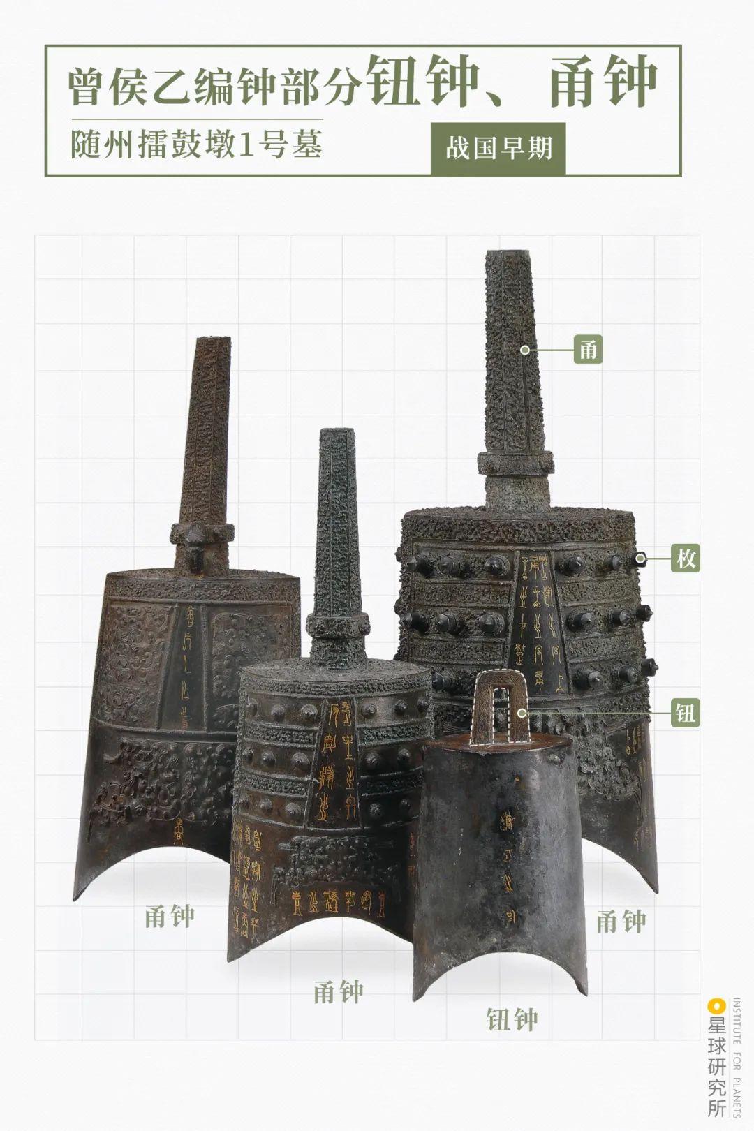 曾侯乙编钟部门钮钟、甬钟,图片来源@随州市博物馆,造图@杨宁/星球研究所值得一提的是,那些钮钟和甬钟外形扁圆,犹如两瓣瓦片相合,是为合瓦形。