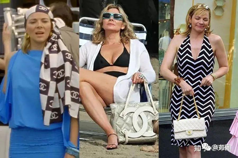 Samantha喜好名牌、Logo带来的身份感,在片中时常有表现。Chanel的双C头巾、包袋她就随时背在身上。
